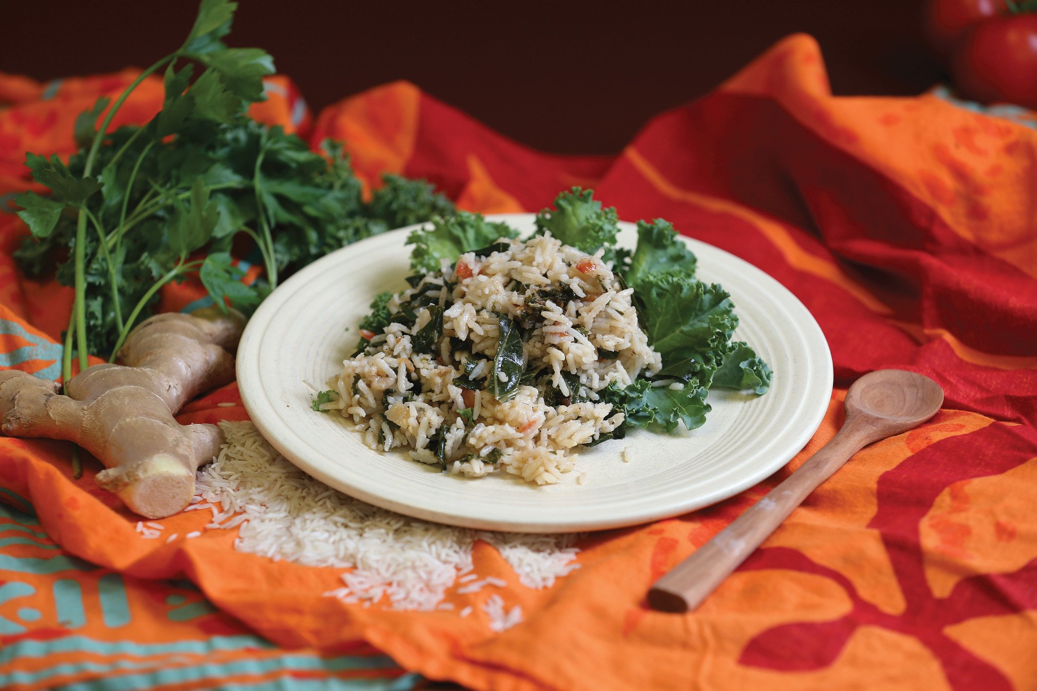 Heat oil in medium-sized pot. Add onion, tomato, garlic and ginger, and sauté until just tender. Add collard greens or kale, and stir 1 minute. Add rice, water, salt and pepper. Bring to a boil. Cover and cook on medium heat for 25 minutes or until water is absorbed.