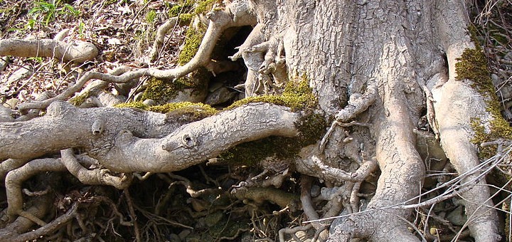 Image/Art Work: Author: Michael Hoelzl; Title/description: durch Hochwasser (des Flusses) wurde der Baum unterspült und die Wurzel teilweise freigelegt; da der Grundwasserspiegel hoch ist, lebt der Baum weiter; Date: 2010; from commons.wikimedia.org; work has been released into the public domain.