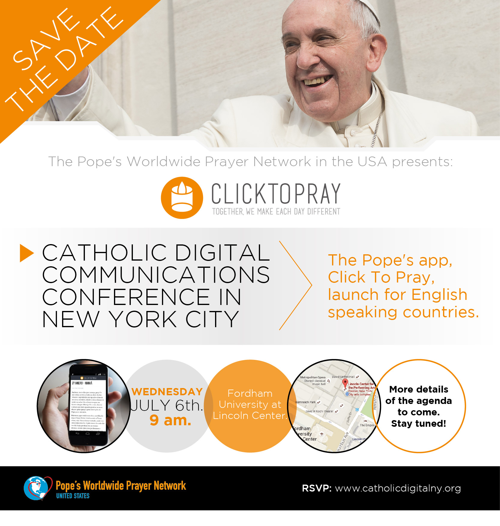 Next July 6th the Catholic Digital Communications Conference will be held in New York. This is an opportunity to spend a day of sharing expertise on digital communications. The speakers will be Fr. James Martin, SJ, Editor-at-large at America Magazine; Fr. Sam Sawyer, SJ, Associate Editor and Director of Digital Strategy at America Magazine; John Harper, Morning Air Host at Relevant Radio; Elizabeth Scalia, Editor-in-Chief, Aleteia.org; Fr. Frédéric Fornos, SJ, International Director of the Pope's Worldwide Prayer Network; Fr. James Kubicki, SJ, National Director of thePope's Worldwide Prayer Network and Juan Della Torre, CEO at La Machi, Communications for Good Causes.