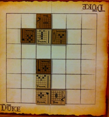 4. Take the Duke Tile and two Footman Tiles from each set of tiles and place them on the board for initial setup. The Duke Tile must be placed in one of the two center squares of the bottom row. The Footman tiles are then placed next to The Duke Tile so that one side is touching. (Note: All tiles must be placed with their name oriented towards the player and the icon in the center of the tile being the dark black pawn.)