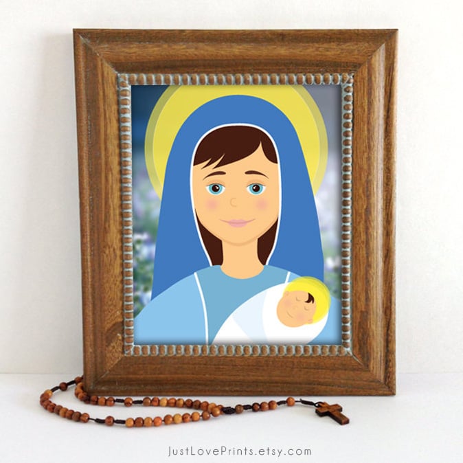 This 8x10 print of the Blessed Virgin Mary with baby Jesus would look great in a family prayer room or nursery! Please note, frame and props are not included.