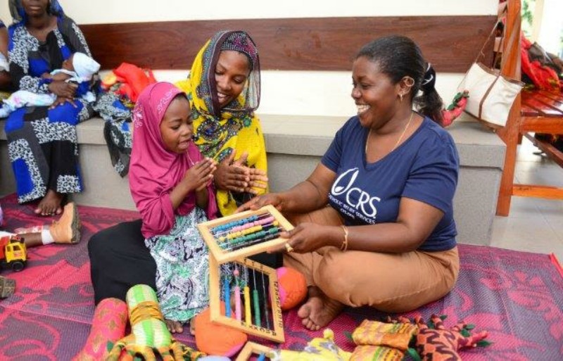 Catholic Relief Services (CRS) trains staff at centers like these to hold workshops for parents explaining the importance of play and teaching them how to create safe, age-appropriate toys using ordinary household items like socks, boxes or plastic bottles. While the parents learn, their children do too, playing with others.