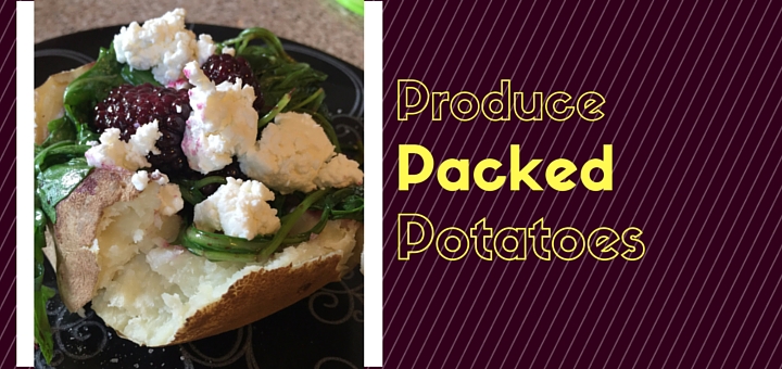 Bake potatoes using your favorite method (we microwaved ours for about 12 minutes). Meanwhile, in a large skillet, heat olive oil over medium heat. Toss blackberries in hot olive oil over medium heat until skins just start to burst. Add arugula/greens and toss to coat with oil & berry juice. Place lid on skillet and allow greens to wilt, stirring occasionally, about 5-8 minutes.