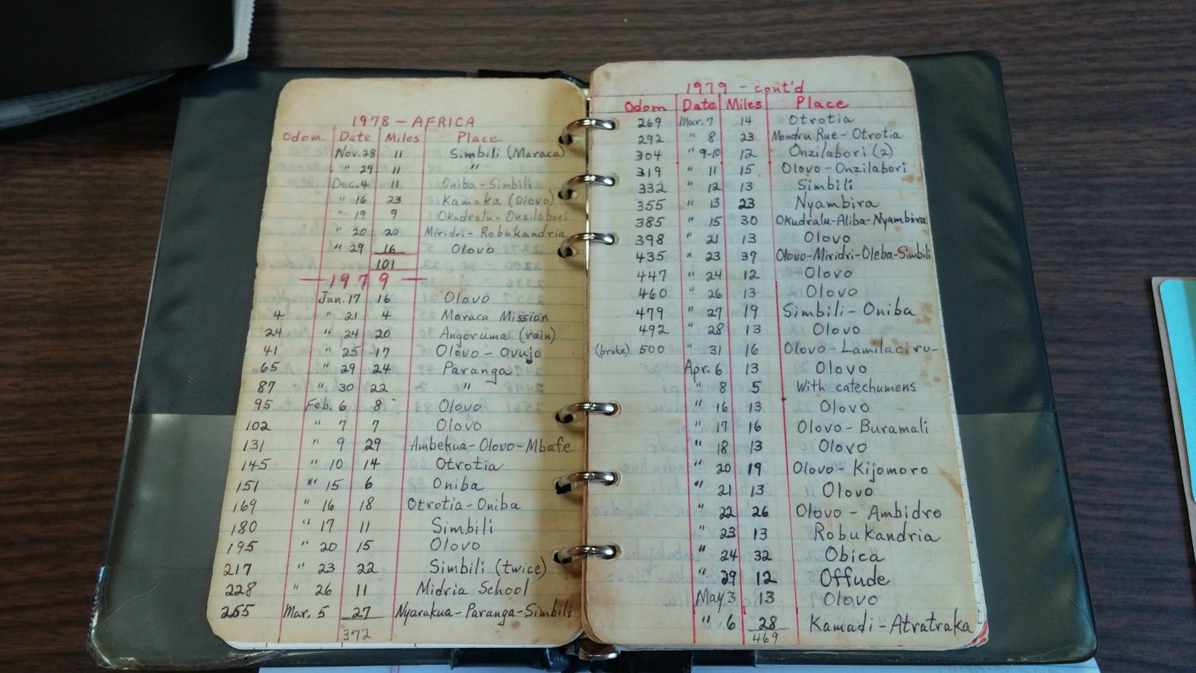 In a careworn leather notebook, Fr. Baltz meticulously records the miles that he has ridden. Years ago, the notebook and many other possessions were taken by soldiers who overran his mission. Later, during a visit to the bishop’s residence, which had also been ransacked, Fr. Baltz found the notebook on the floor.