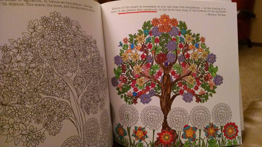 As I sat in Starbucks on my night off from putting the children to bed I slowly filled in the intricate design of a flowering tree, having underlined part of a quote from Mother Theresa above: