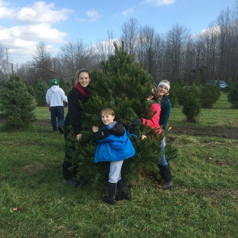 Although the tree pictured is not the one we ended up choosing, its soft needles lured the kids in, and they could not resist a huge hug! This specific tree happened to be far softer than the others we had scouted out, including several that had left painful memories on our hands. However, these deceptively pretty needles became sharp reminders as to why we consider our devotion to our hardy growing neighbors.