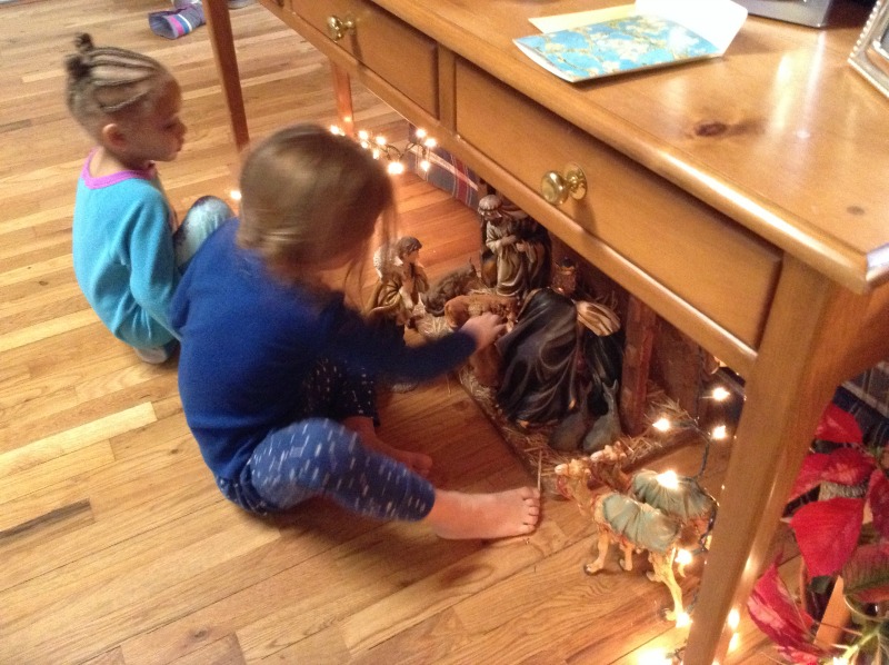 I stopped what I was doing, curiosity getting the best of me. I looked over the counter, but two little lumps of pajamas sitting cross-legged were in front of the stable and I couldn’t see anything, so I went over to the stable and knelt down.