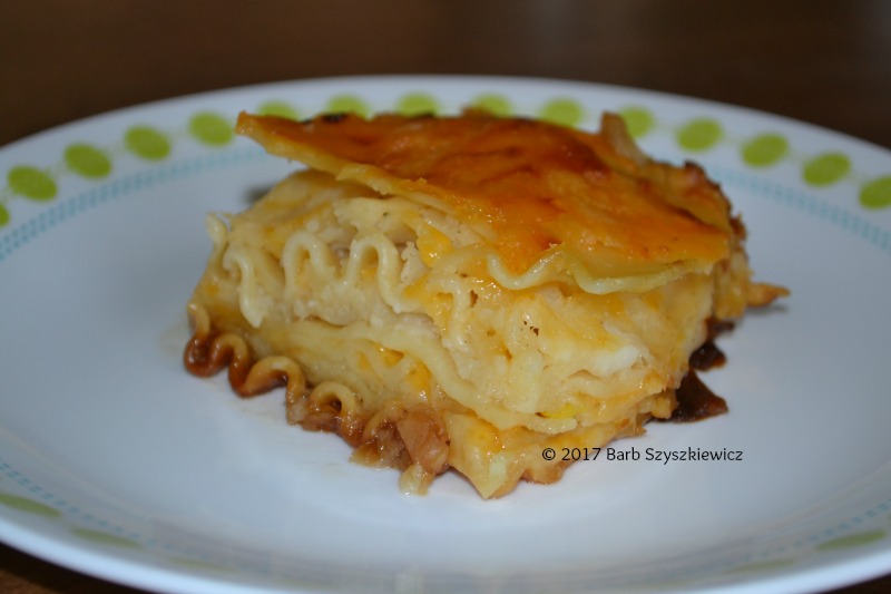 This lasagna dish is delicious. You can make it for your Meatless Friday by following the recipe as written below, or sauté the onions in bacon grease instead of butter for flavor close to my in-laws’ pierogi (they use rendered salt pork to cook the onions–but bacon works in a pinch).