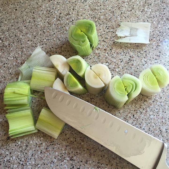 Lent-friendly note: make vegetable stock! We keep our leek tops in a bag in the freezer along with any other vegetables that are about to go bad (floppy celery, shriveling carrots, onions starting to sprout, garlic cloves that have seen better days, etc.) When we have enough to fill a slow cooker about half way, we put the vegetable scraps in the slow cooker, top the rest of the way with water, and cook on low for 6-10 hours. Then we drain out the scraps and store the stock in 2 quart freezer containers. We then use the vegetable stock in place of any meat-based broth or cooking wine a recipe requires.