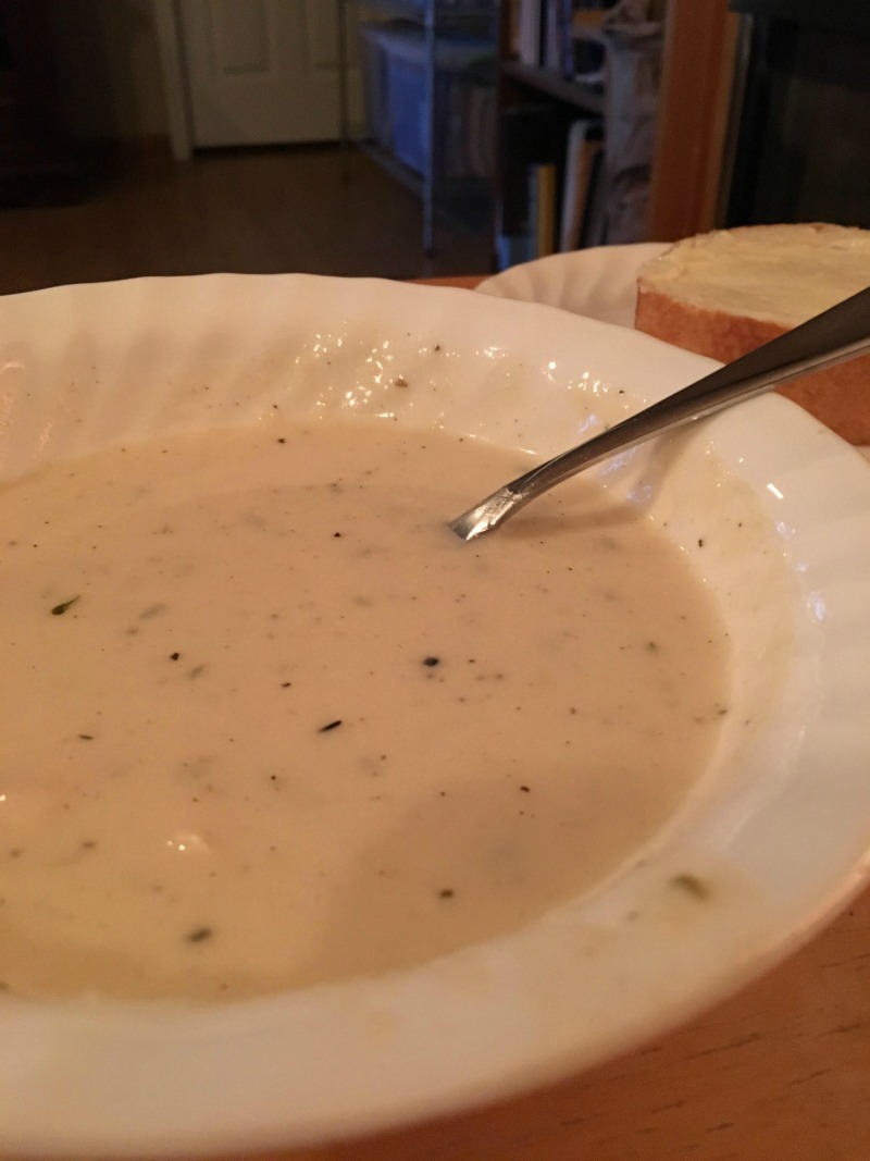 The soup goes really well with a nice, crusty French loaf. It doesn't hurt that, thanks to using 1% milk and fat-free evaporated milk, it comes in under 400 calories per serving (crusty French bread not included in that calorie count).