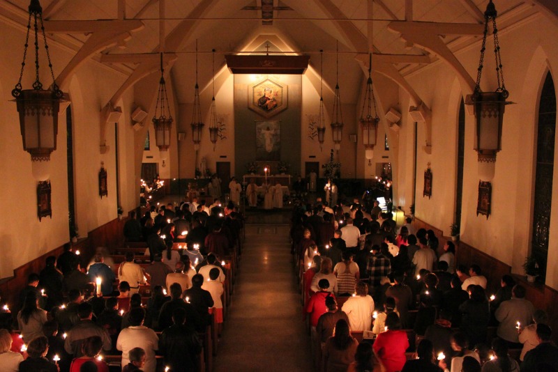 Soon the church is suffused in a warm light, comforting candle light. All is quiet as the priest slowly walks up the aisle to the main altar, chanting the ancient words,