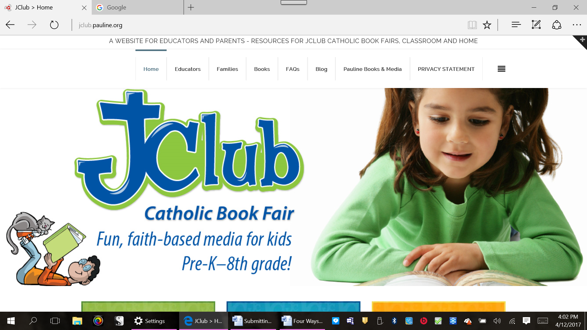 Many Catholic schools were looking for a substitute or supplement for Scholastic book fairs. The teacher’s and librarians realized that they had to review the books before letting the students purchase them. Many themes were unsuitable for children and some were actually harmful to their faith and morals. Requests for a Catholic book fair that was organized in a way similar to Scholastic book fairs hit the social media channels. Pauline Sisters had been holding school book fairs from their local bookcenters for years. What about the schools the Sisters were unable to reach? Pauline Books & Media is known for the quality of its children’s publications. How might these reach a wider audience? What about including other quality children’s books and media from Catholic publishers (such as Lisa Hendey’s Chime Travelers)? After a two year study JClub Book Fairs (Where the “J” stands for Jesus!) launched.