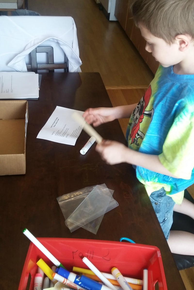 Each week's craft comes in a little sealed bag, clearly dated, with easy to follow instructions and list of materials. The materials are all pretty standard, and if the craft calls for a more specialty item, it is provided. Our craft even had a glue stick included, which, I know is not exactly specialty, but you would be amazed at how quickly those little buggers can go missing around here.