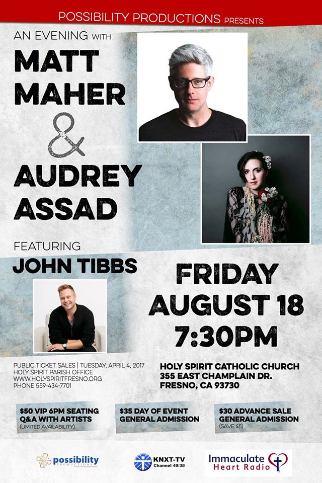 Visit www.holyspiritfresno.org TODAY to purchase your tickets for an Evening with Matt Maher and Audrey Assad, Friday, August 18 in Fresno, California.