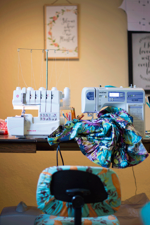 - My blog and freelance work relies on actual production of handmade goods from me. I do have a large table that is comfortable for me to sew several garments in a few hours. I also have organized my area so that more dangerous items (cutting tools, pins, etc.) are out of reach from my children at a moment's notice. After several months of blogging, we assessed my needs and I reorganized our play area to give me this advantage. This has really helped me be more productive with my time, and allows my work to not distract me in other areas of our home such as when we are doing school.