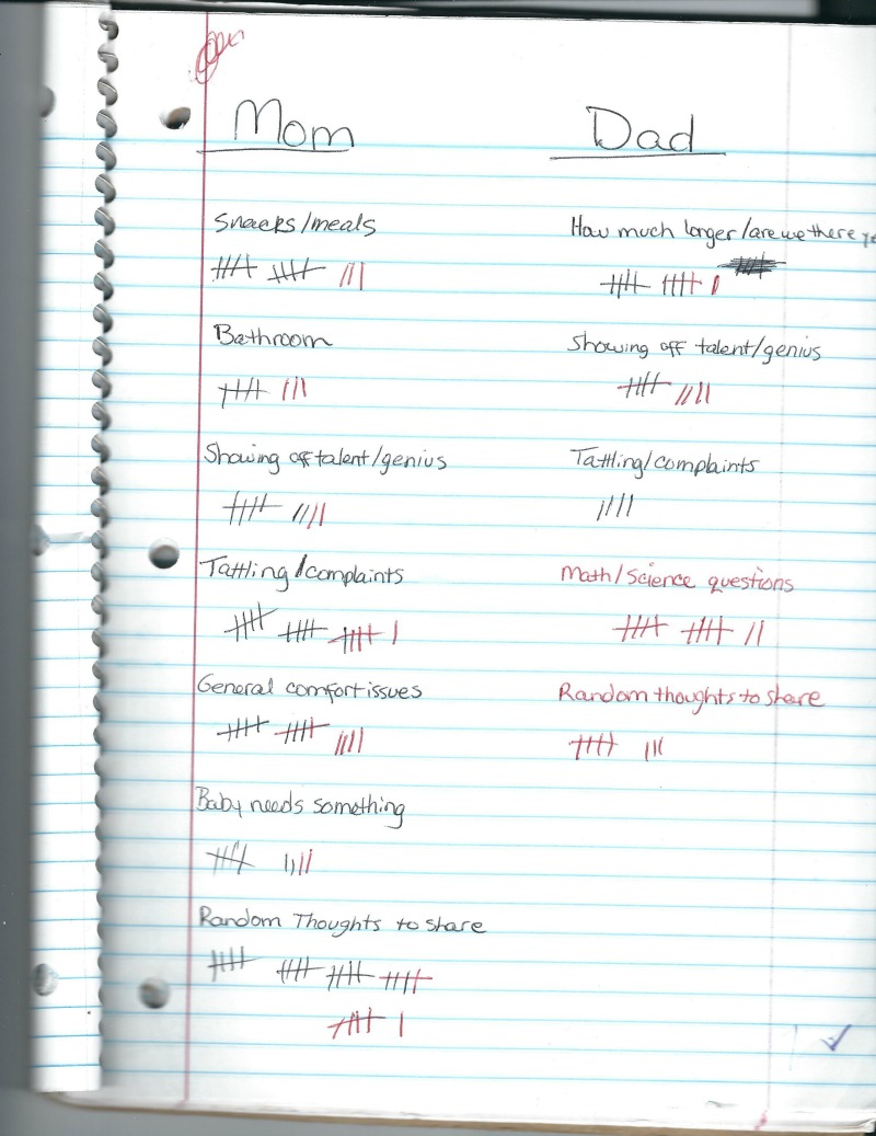 Mom: My questions were more about immediate needs and comfort issues. Potty breaks, snacks, temperature adjustments, miscellaneous thoughts that pop into their little heads, and (my personal favorite) tattling/whining about the various injustices occurring in the back of the van.