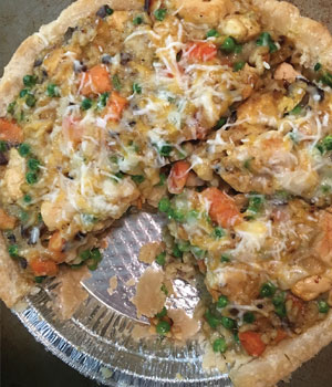 Cook risotto according to directions. While it’s cooking, cook chicken in large cast-iron pan in olive oil. Add carrots and sweet potato. When almost cooked, add frozen peas, garlic, and onion. Stir frequently, add seasonings. Fold in cooked risotto and mushroom soup. Add all to pie crust and bake in 350-degree preheated oven for 35 minutes. Add cheese on top during last 5 minutes. Enjoy!
