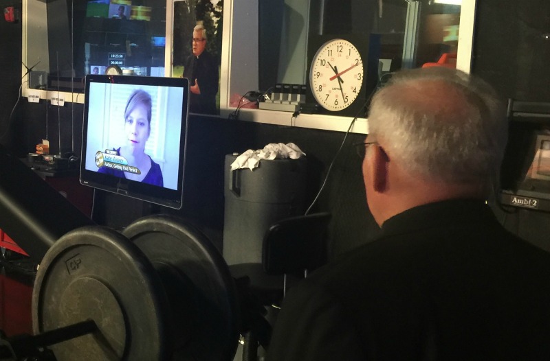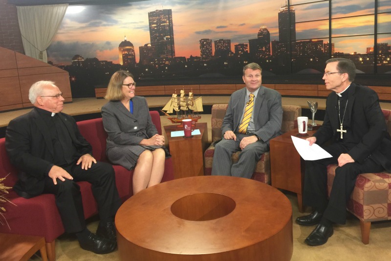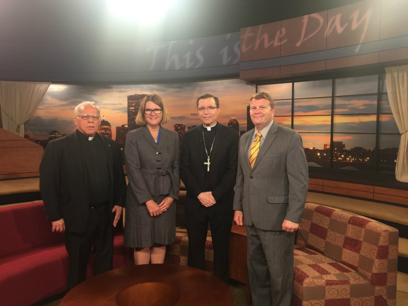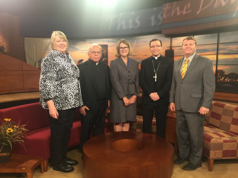 The program began with a Skype interview of Kate Wicker, author of Getting Past Perfect, the recently-published CatholicMom.com book from Ave Maria Press. Father Willy Raymond, CSC, president of Holy Cross Family Ministries, watched the interview from the wings while waiting to join CatholicMom.com's Lisa Hendey and hosts Bishop Robert Reed and Jay Fadden for the announcement.