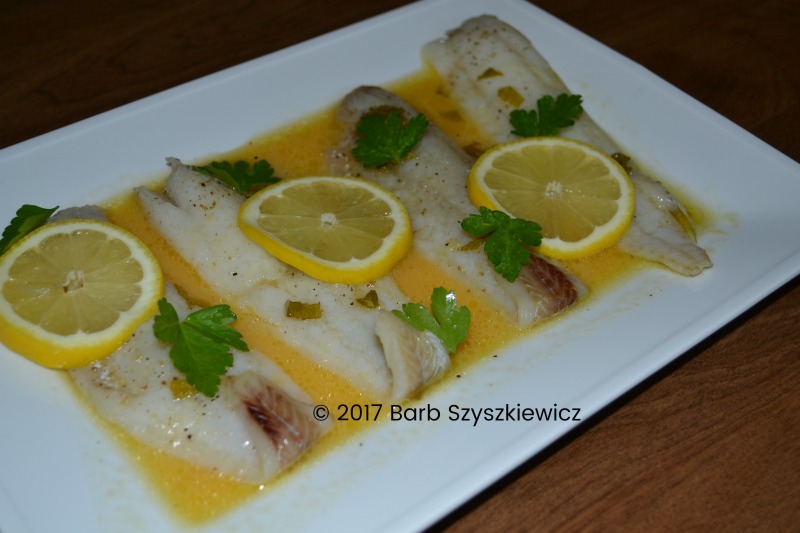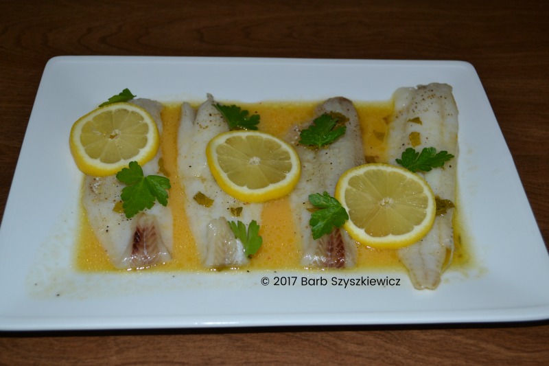 Remove cooked fish to platter and pour some of the sauce over the top. Garnish with fresh lemon slices and parsley or mint leaves. Serve the remaining sauce on the side.