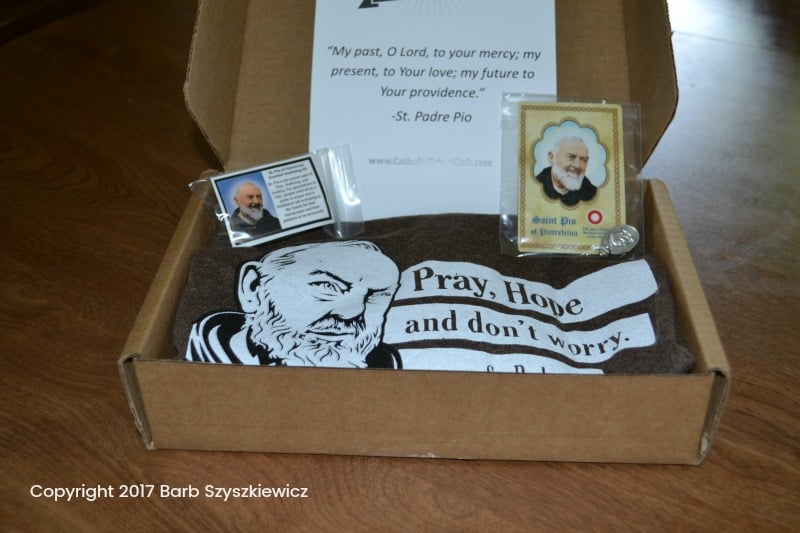 The box shown above is the "Bishop" box; it included the soft, brown Padre Pio-themed T-shirt, a vial of holy oil with information about its use, a prayer card containing a third-class relic of Saint Pio, and a Saint Pio medal. The sacramentals are not blessed, so those will need to be taken to a priest or deacon before use.