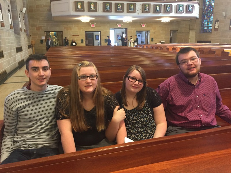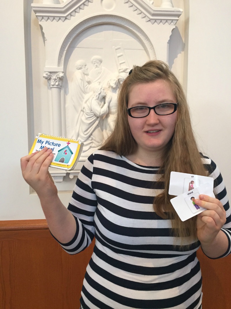 Usually our family attends the 9:30 Mass at our home parish of St. Isaac Jogues. Not only do we regularly attend that Mass, but we can almost always be found in "our pew" right near the choir on the right side of the church. We refer to it as "our pew" because our daughter Danielle, who has autism, likes the routine of sitting in that spot. We selected it strategically because she loves music. For her and many people with autism, structure and routine helps situations flow more smoothly, especially social situations. Nowadays she looks forward to going to Mass and is a regular participant. On Sunday mornings she will often say, "I want to go to church" using her augmentative communication device. This device allows her to communicate in words even though she is non-verbal.
