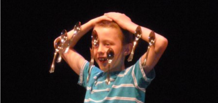 He calls up a different child from the audience to be his assistant for almost every trick he does. Years ago, he chose my oldest son Zack. BJ magically attached spoons all over Zack's arms and face. It was an incredible thrill for him.