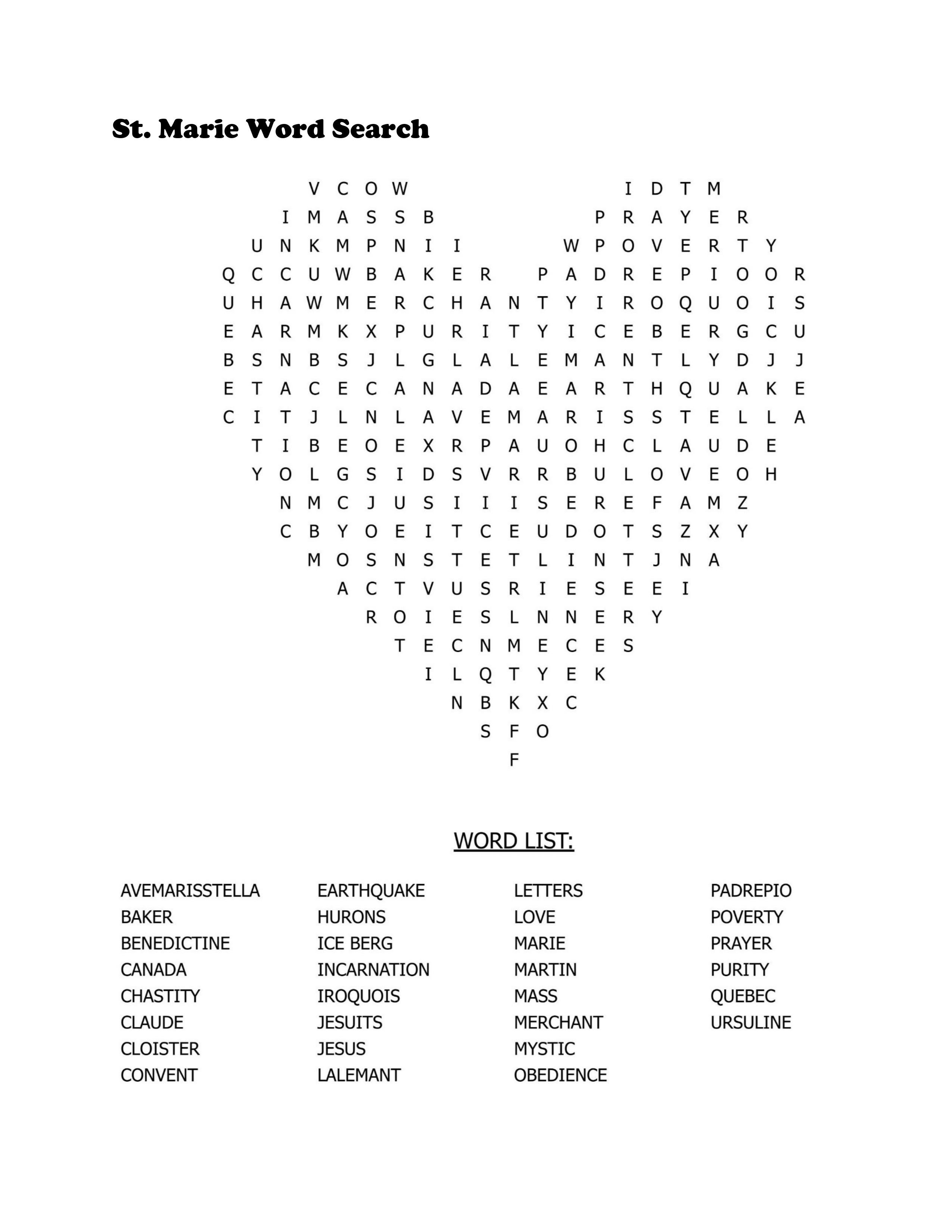 St. André Bessette is the first saint I want to explore and discuss. This activity book has a brief biography of this great saint. He grew up in Montreal and was a simple young boy. He even went to the U.S. briefly during the Civil War to work in a factory. He came back and joined the Holy Cross brothers in the Montreal area. Brother André adopted the practice of his fellow brothers by anointing the sick with holy oil of St. Joseph as the brothers had a deep devotion to him. Who would have thought that this great devotion led our saint to help start the biggest cathedral in Montreal dedicated to St. Joseph? I have been to this wonderful cathedral and it is huge. There is a main church and a crypt church (basement). There is also a place for travelers to stay; while my brother and I were visiting we stayed in this special “hostel.” Anyway, I will not finish all of our saint’s story here – so read the wonderful book and maybe start your own devotion to St. Joseph! There are some activities in the book related to the saint, and the book also offers information about holy oil and holy medals.